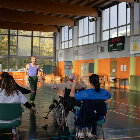 La compagnie a développé des ateliers de danse liée à l’intimité au centre de réadaptation. Ces ateliers ont permis un travail autour du regard, de la prise de contact par la danse et le touché. L’objectif étant de se demander ce que le contact peut porter comme affects et rapports d’intimité, ainsi que sur le rapport que chacun.e entretient avec son corps et avec le contact d’autres corps.